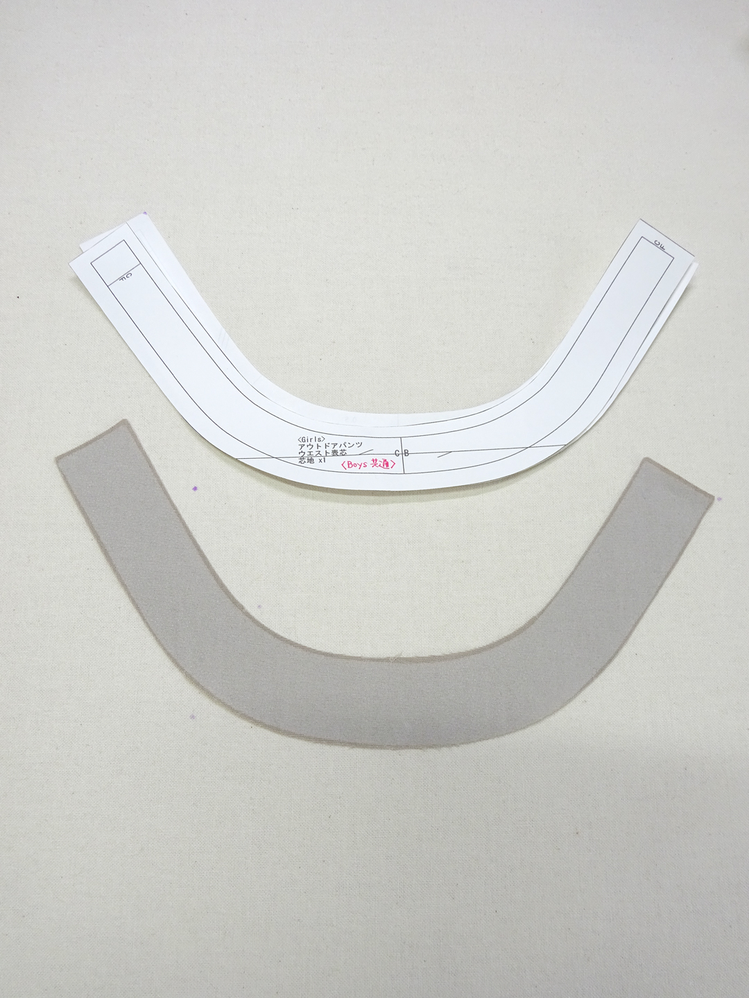 ウエスト表パーツとウエスト裏パーツを中表にし、仕上がり線を地縫いします。