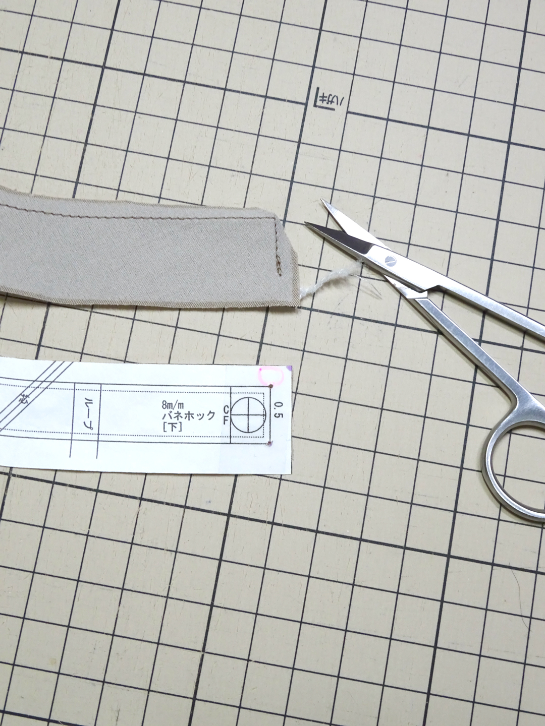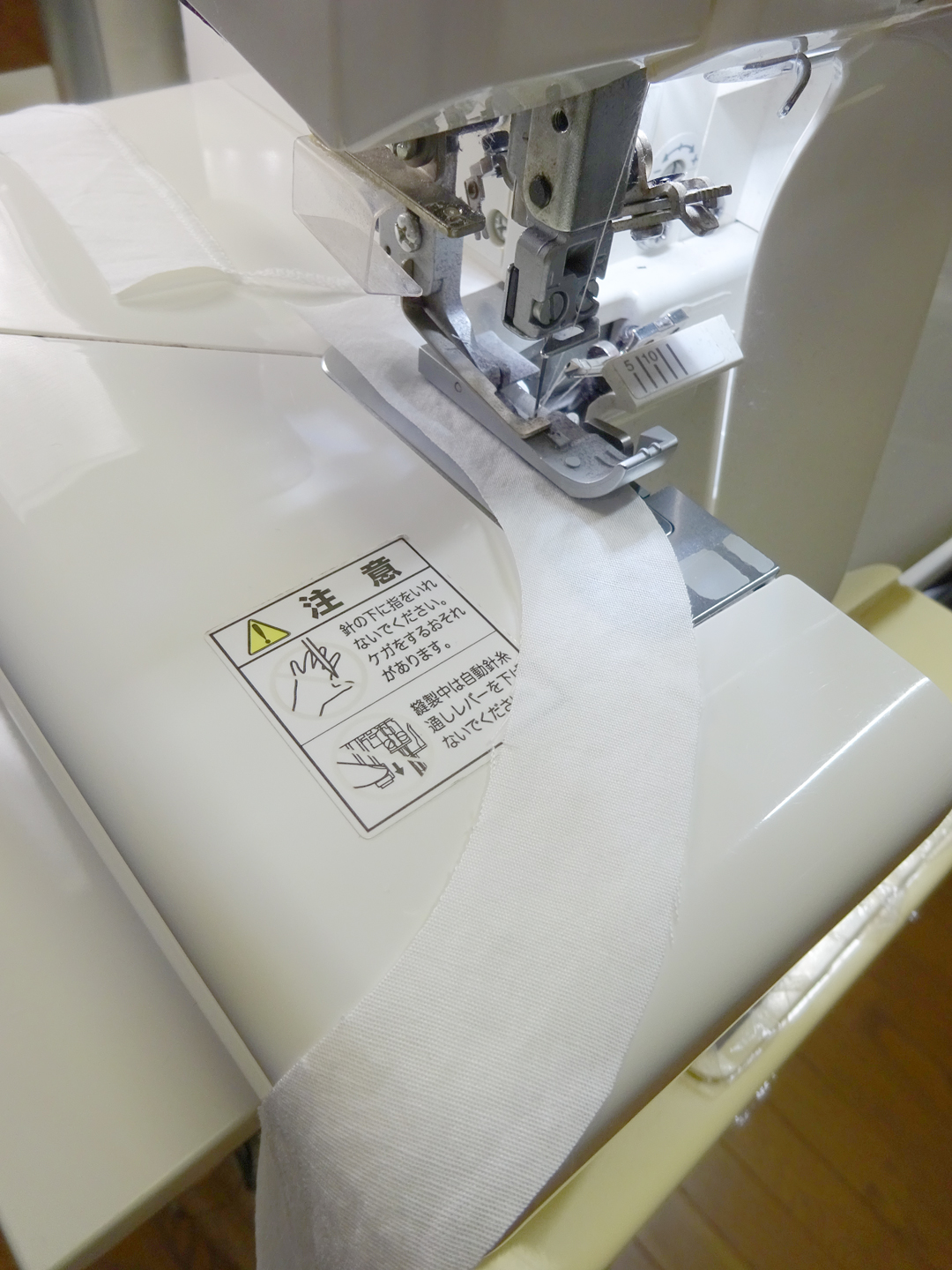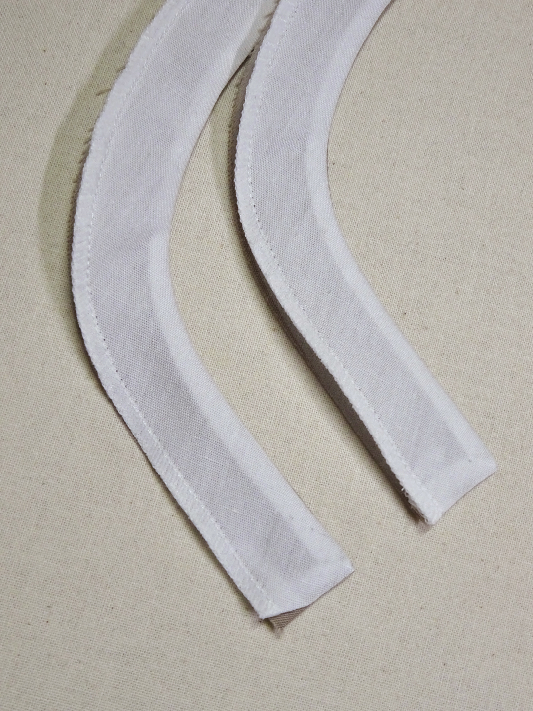 最後に、ウエスト裏パーツの前下端の縫い代を斜めに折り込みます。(完成時に裏パーツが表にはみ出さないように)
