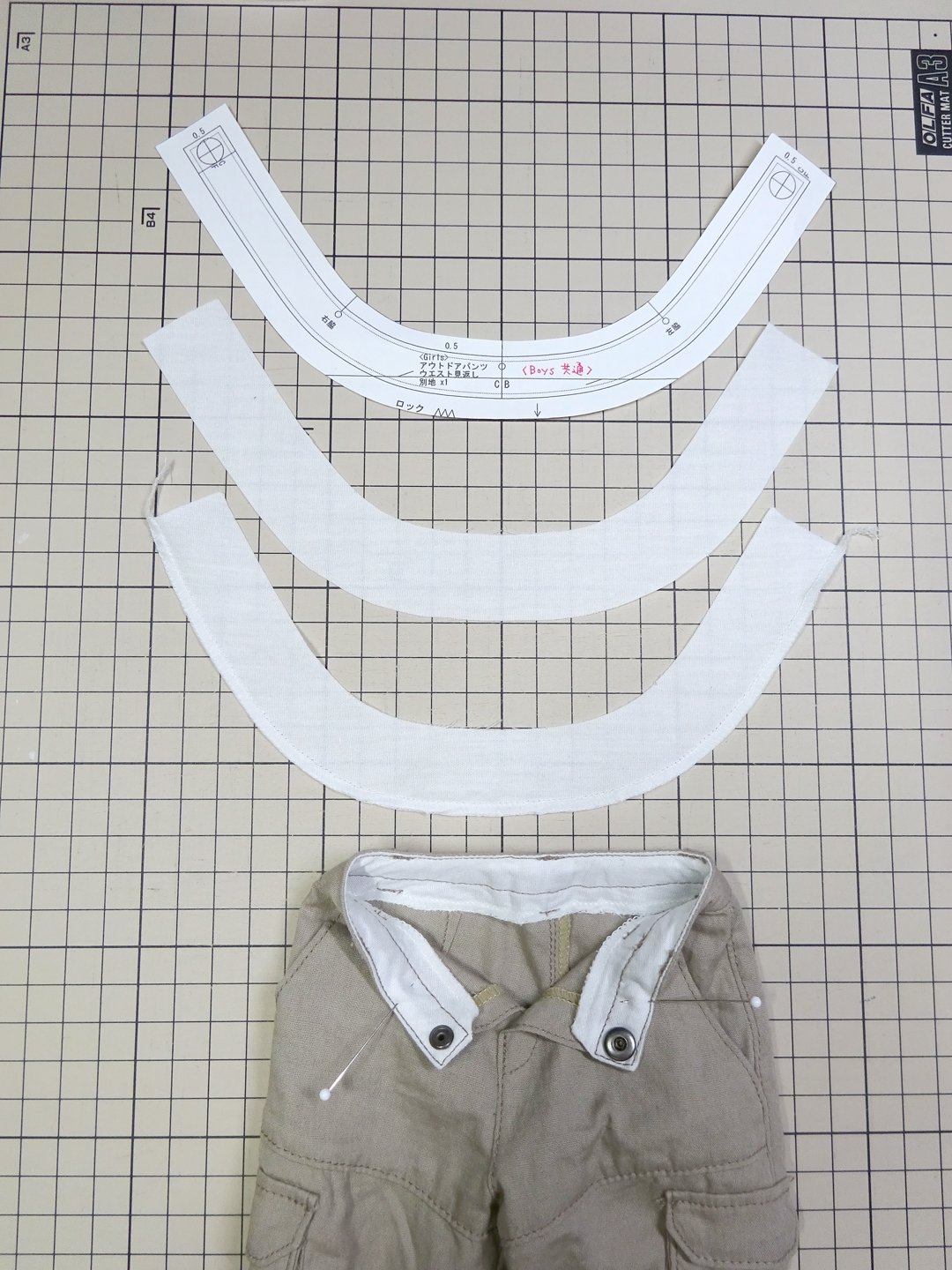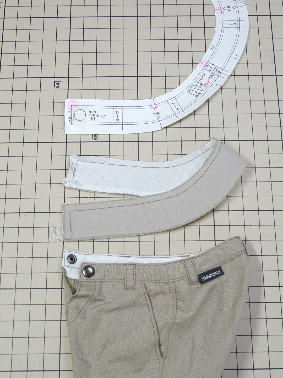 ウエスト表パーツの裏側に、仕上がりの角になる位置で印を付けます。(角の仕上がり精度を高めるため)