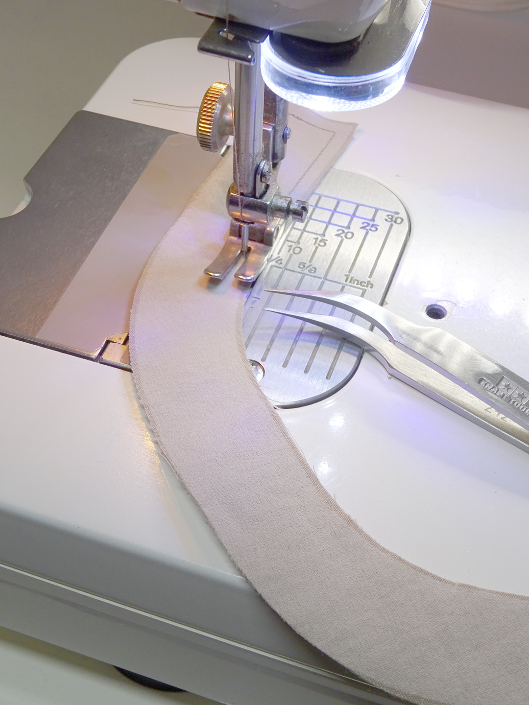 I place the outer and inner waist pieces right sides together and stitch along the seam line.