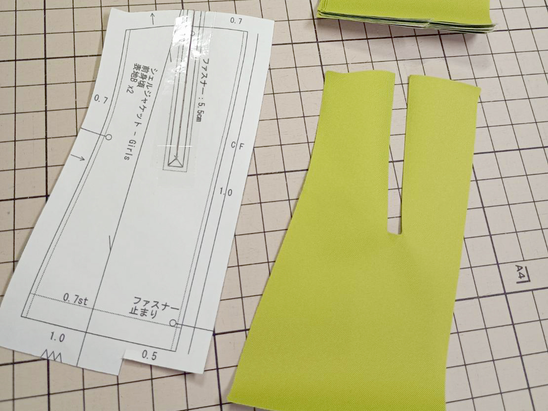 シェルジャケットの胸ポケット作成の続きです。接着芯を貼った胸パーツにパターンを重ね、ファスナー中心に切り込みを入れます。