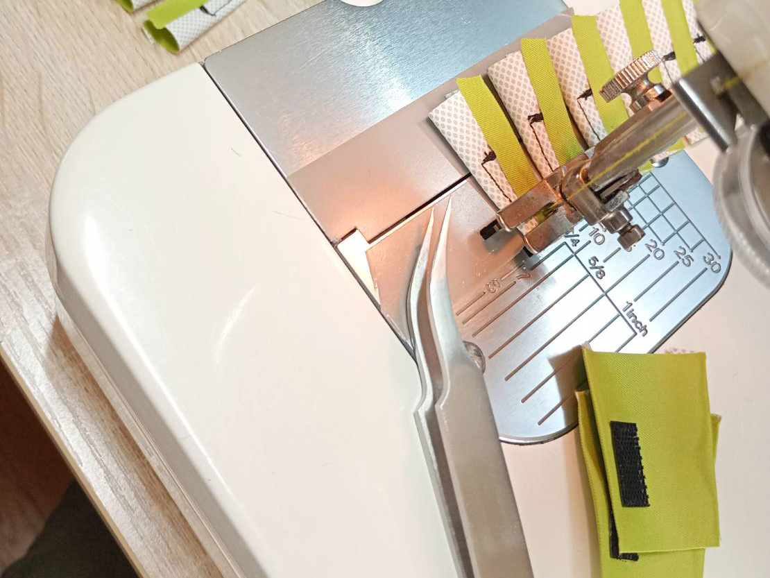 タブパーツの周りにコバステッチ(端ミシン)をかけます。