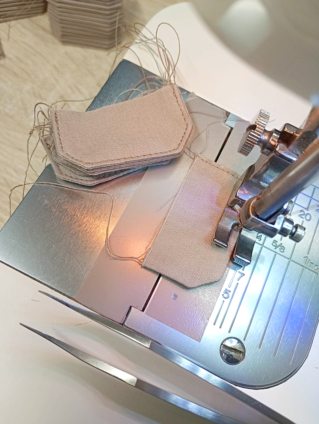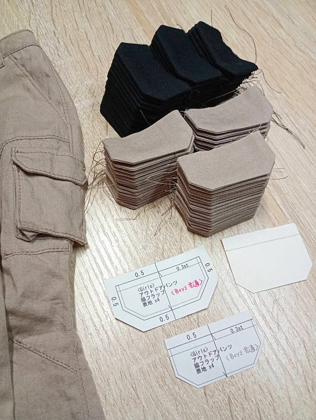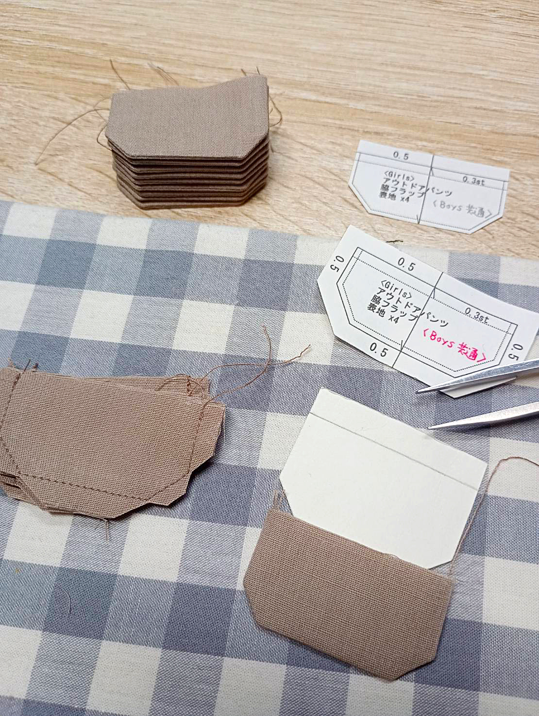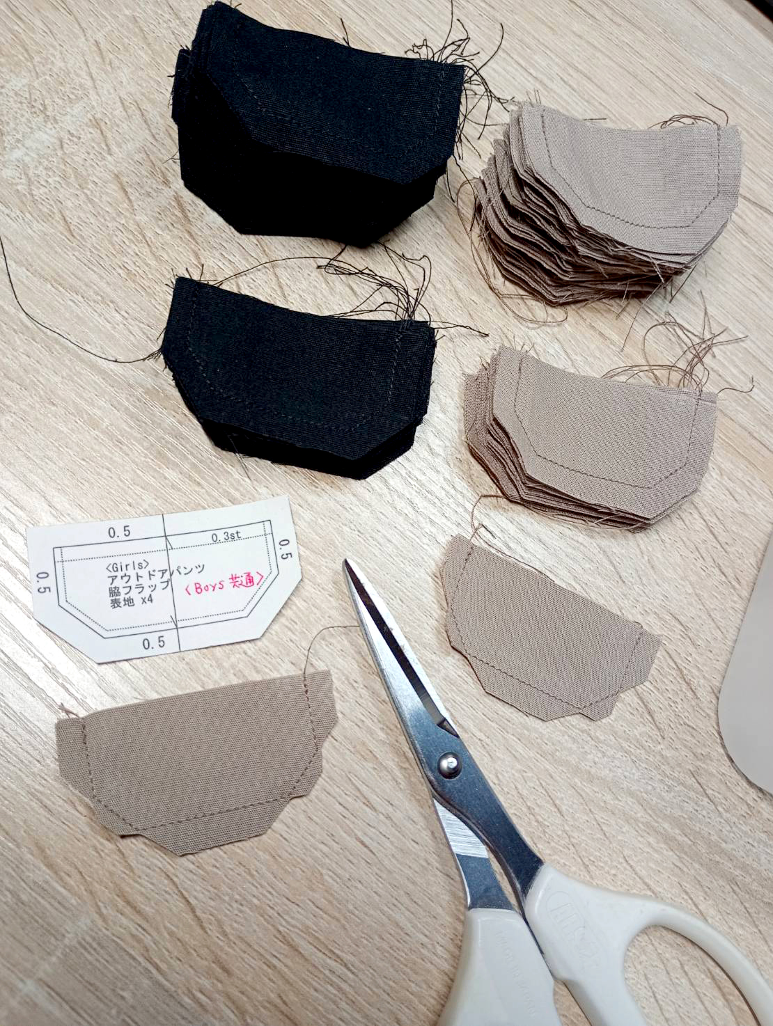 今日はアウトドアパンツの脇ポケットフラップの制作。まずは仕上がりサイズにカットしたサンドペーパー(ズレ防止)をガイドに、フラップの表裏を地縫いします。