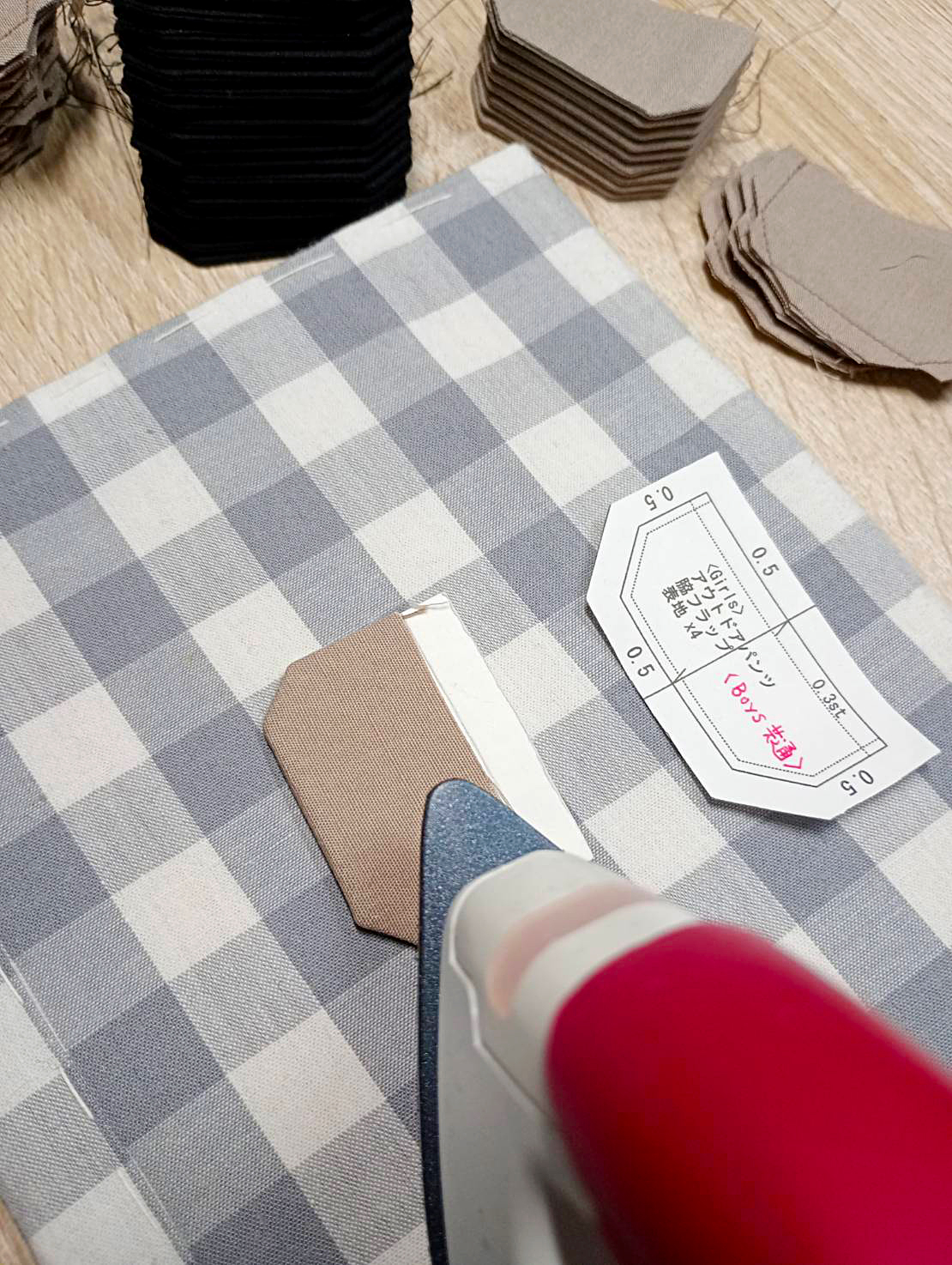 フラップを表に返し、仕上がりサイズにカットした厚紙を差し込んでアイロンをかけます。