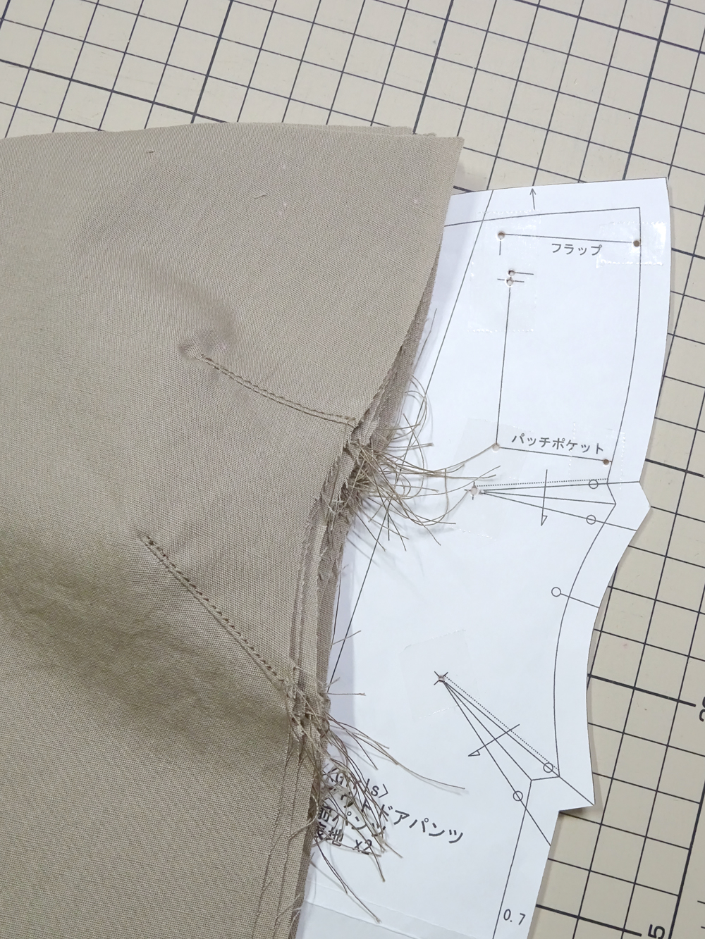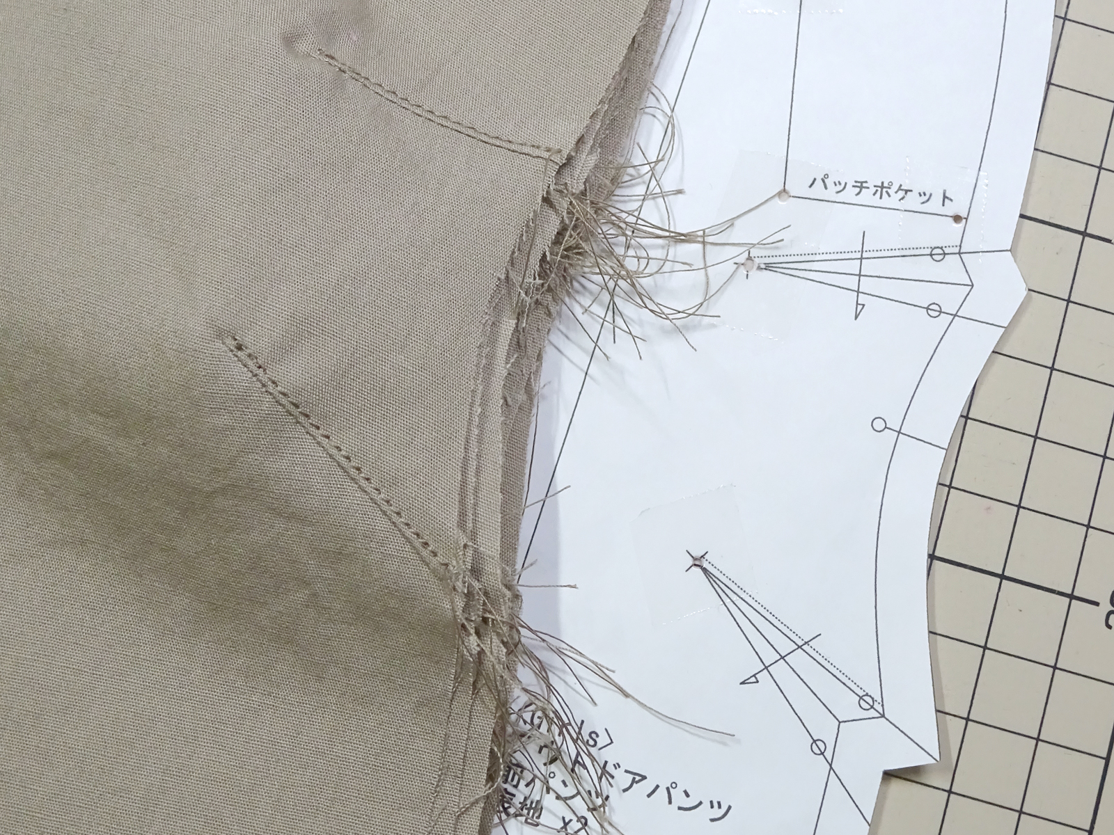 今日はアウトドアパンツのひざダーツ縫い。まずはダーツを入れるパーツの裏側に、ダーツ先端の印を付けます。