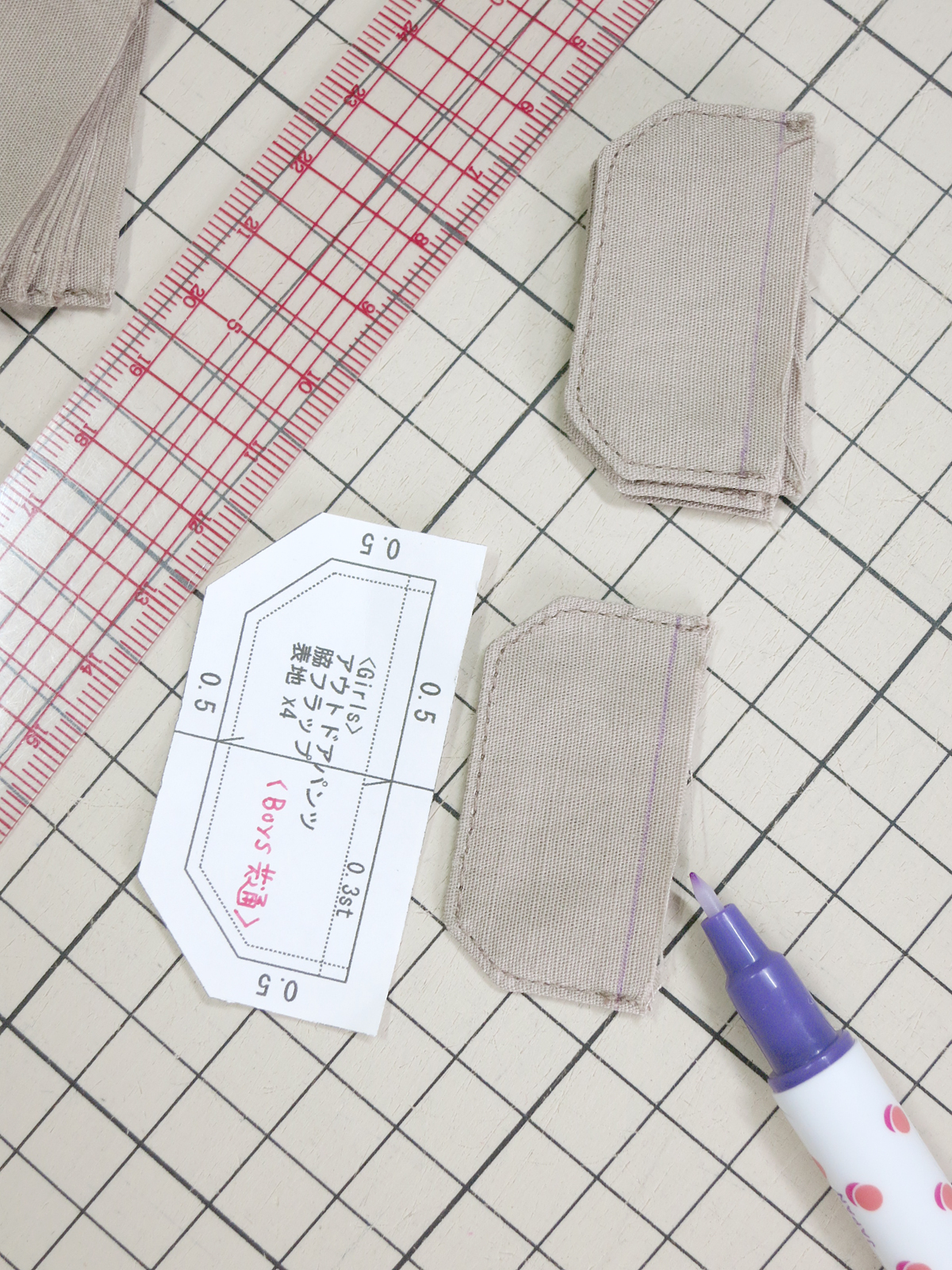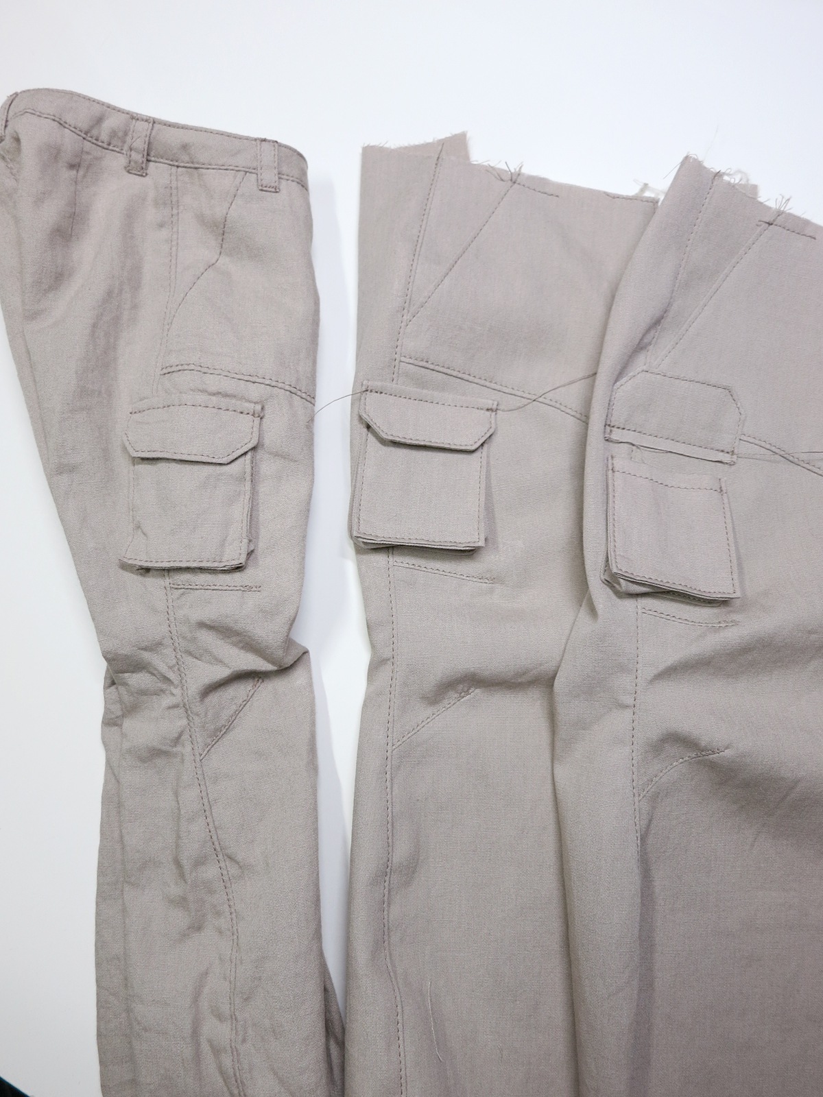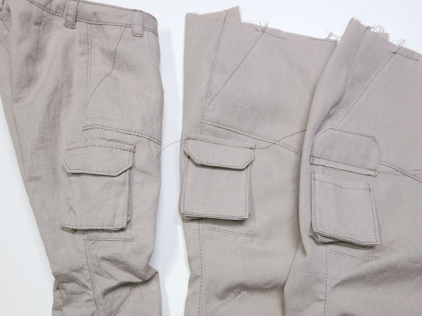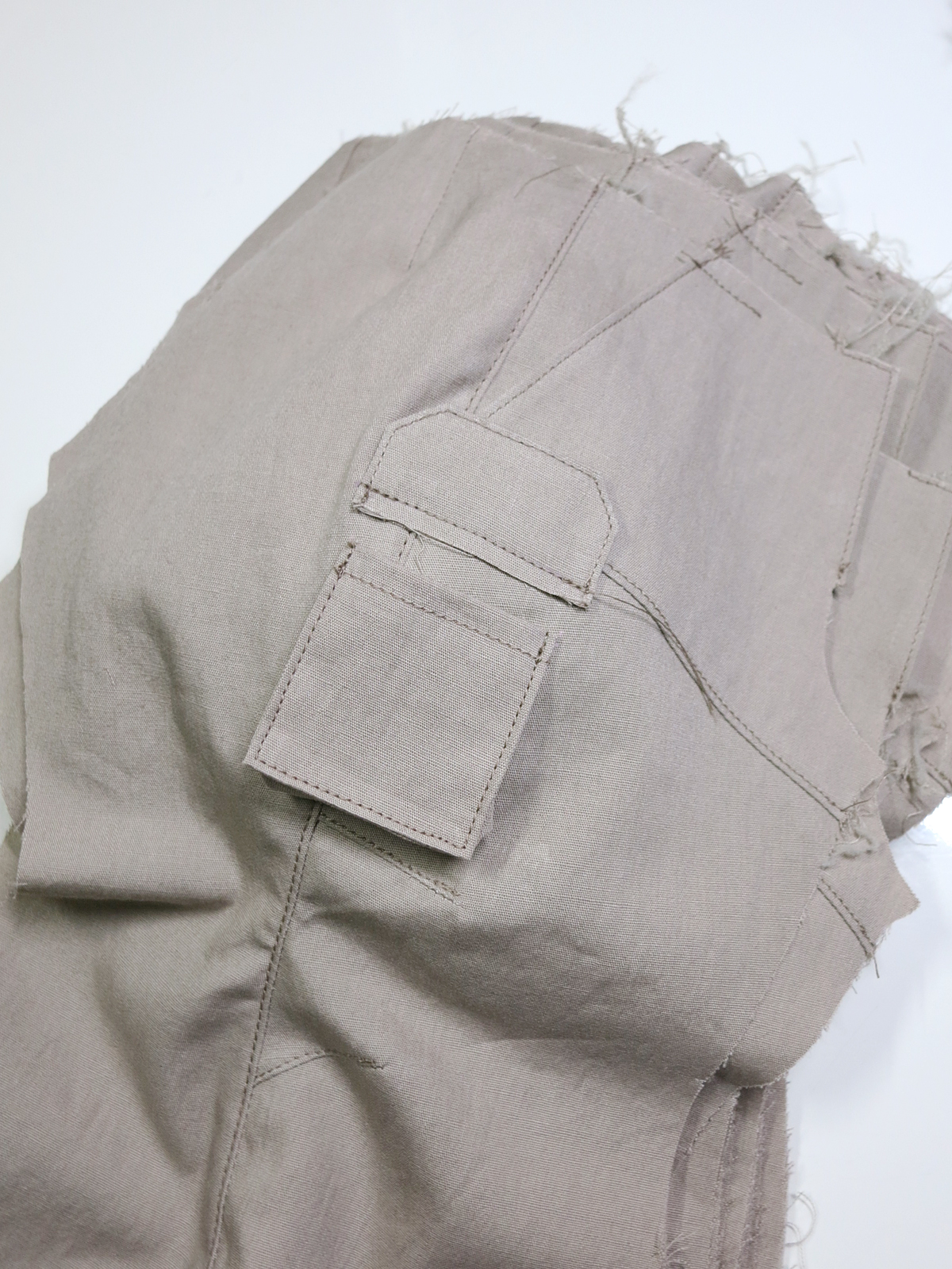 今日はアウトドアパンツのパッチポケットを身頃に付けます。マチを付けたポケットパーツを、身頃の印に合わせて縫い付けます。