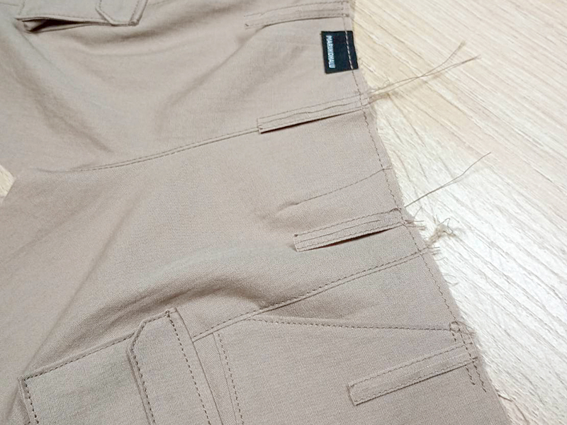 Today, I’m temporarily attaching the waist loops and the woven label for the outdoor pants. I fix the waist loop pieces and the woven label in place with fabric glue.