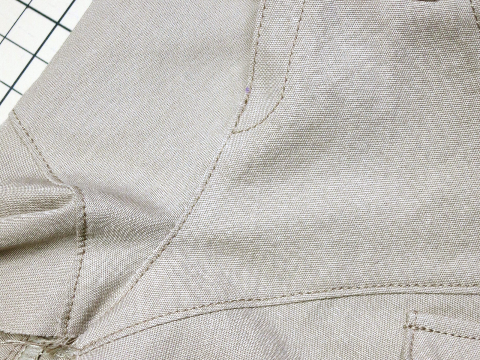 表に返して端ステッチをかけ、前股ぐりの仕上げは完了。