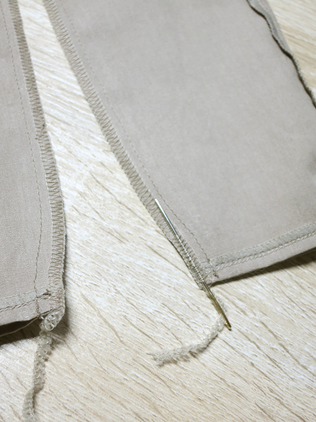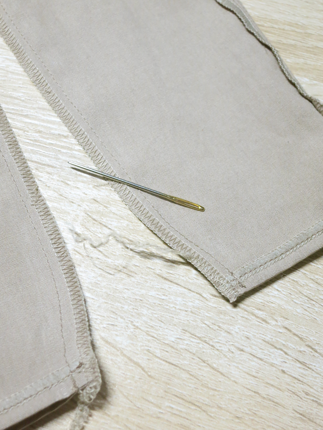 I use a yarn needle to tuck the excess threads from the overlocked inseam into the wrong side of the seam.