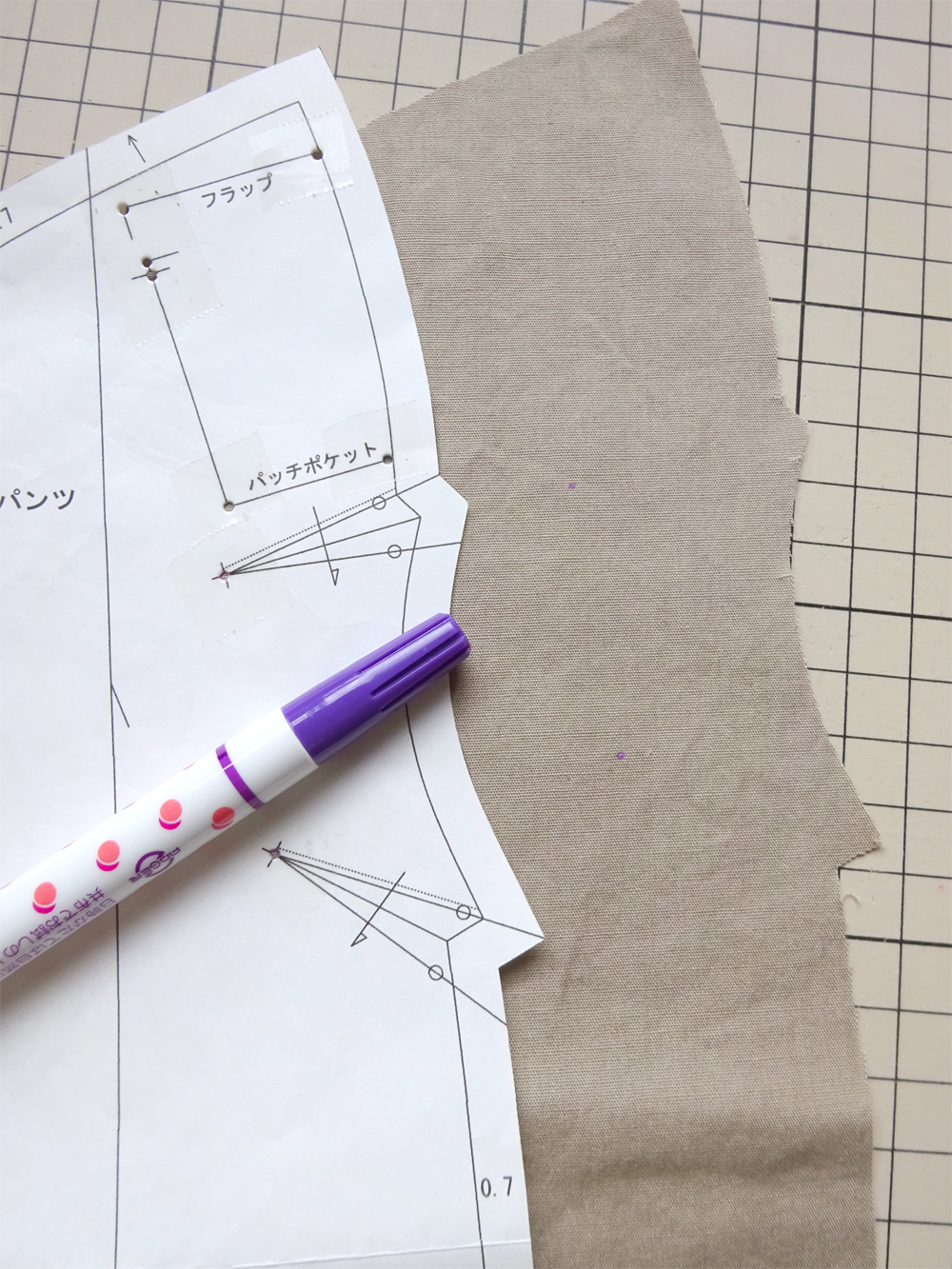 Today, I’m sewing the knee darts for the outdoor pants. First, I mark the dart point on the wrong side of the piece.