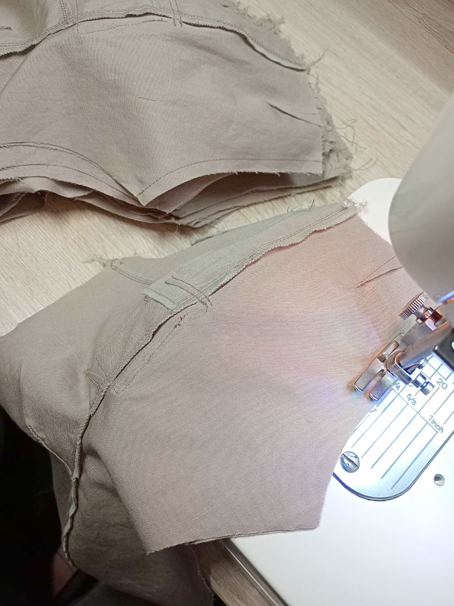 Today, I’m working on the back crotch seam of the outdoor pants. I sew the left and right back crotch pieces together, right sides facing.
