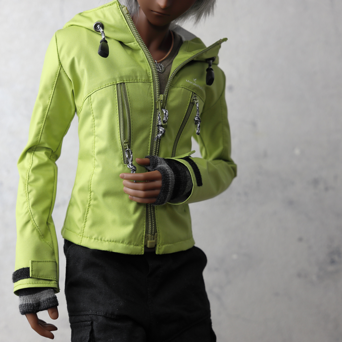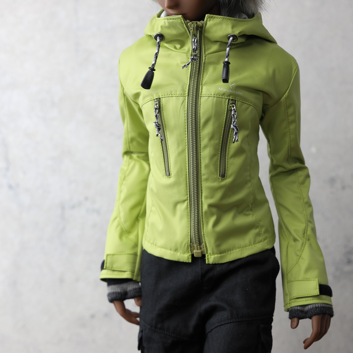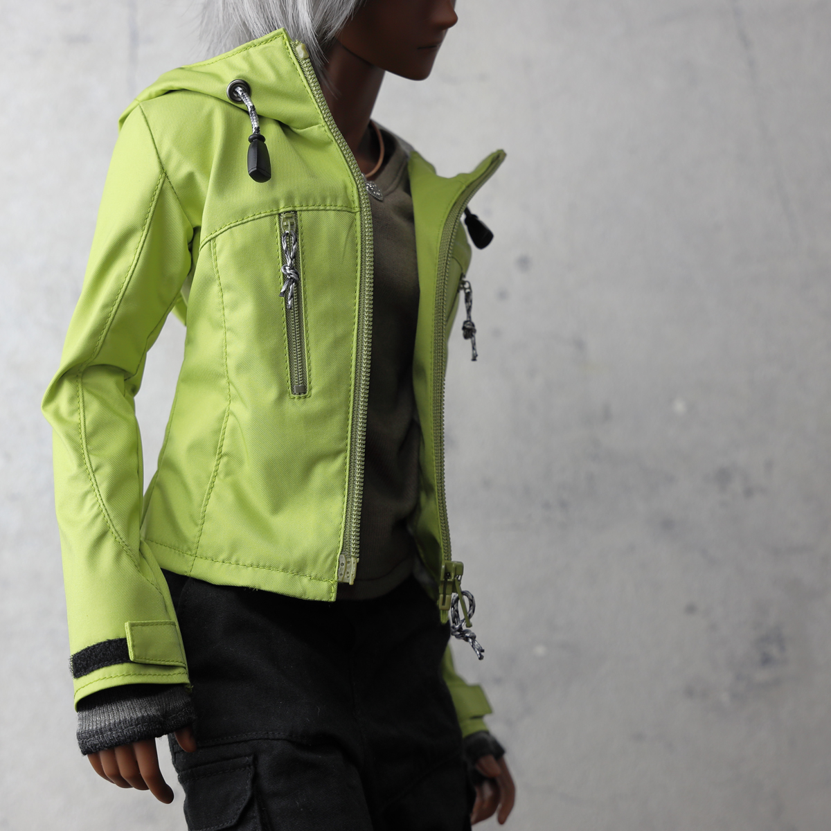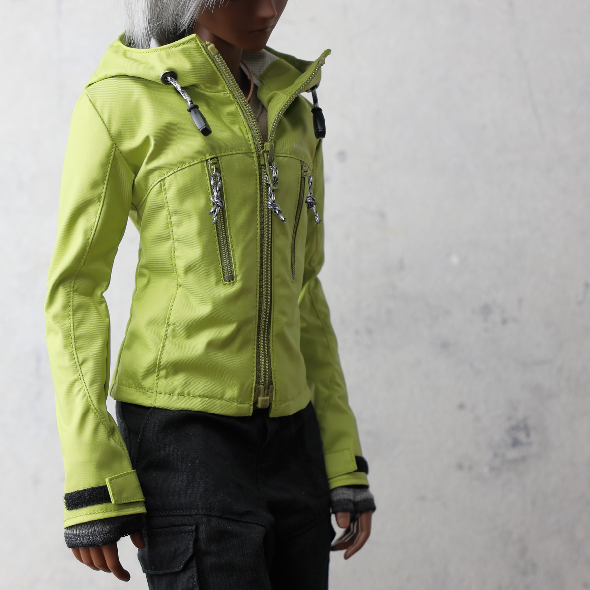 現代的なアウトドアジャケットをイメージした縦ポケットデザイン。視覚的なアクセントを優先しているためポケットファスナーは開閉できますがドールサイズの仕様都合で、限りなくダミーポケットです。 -