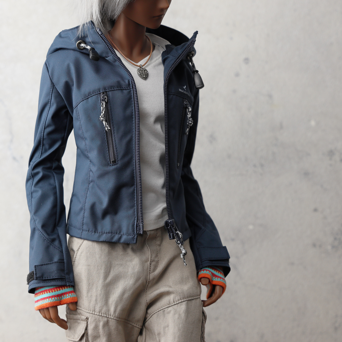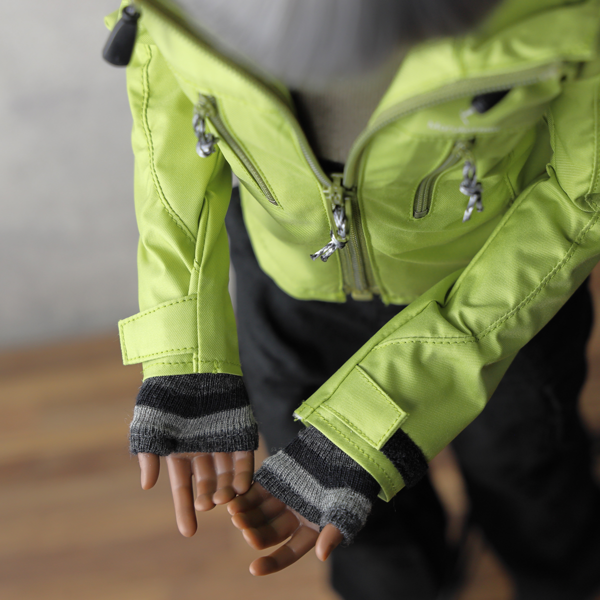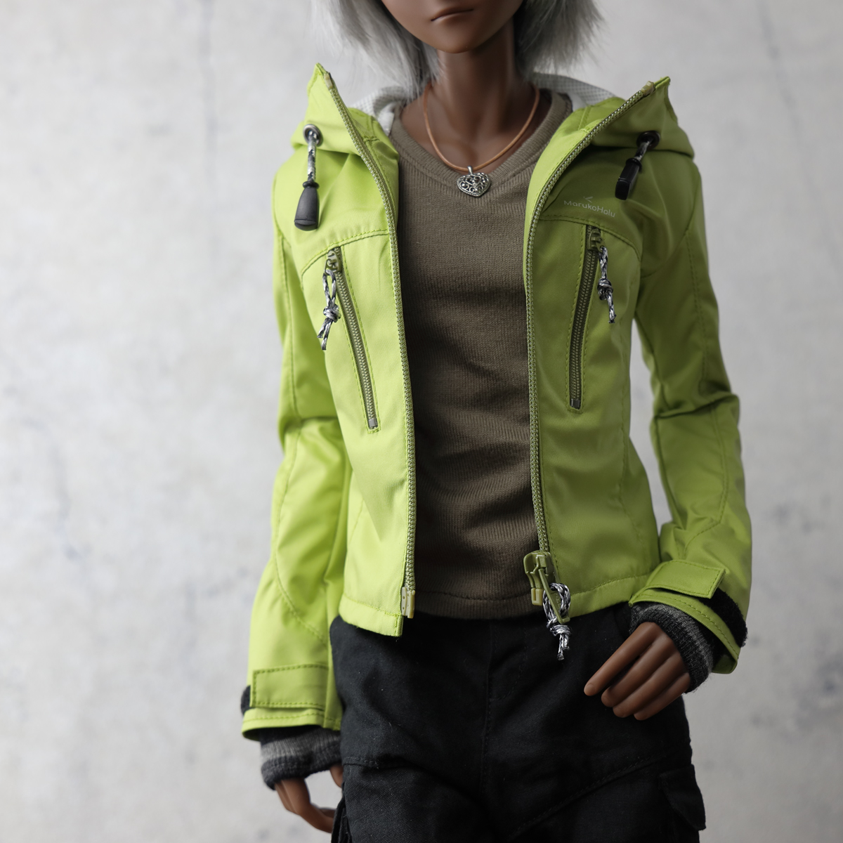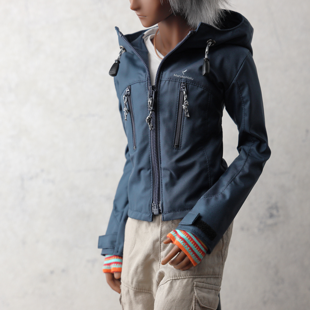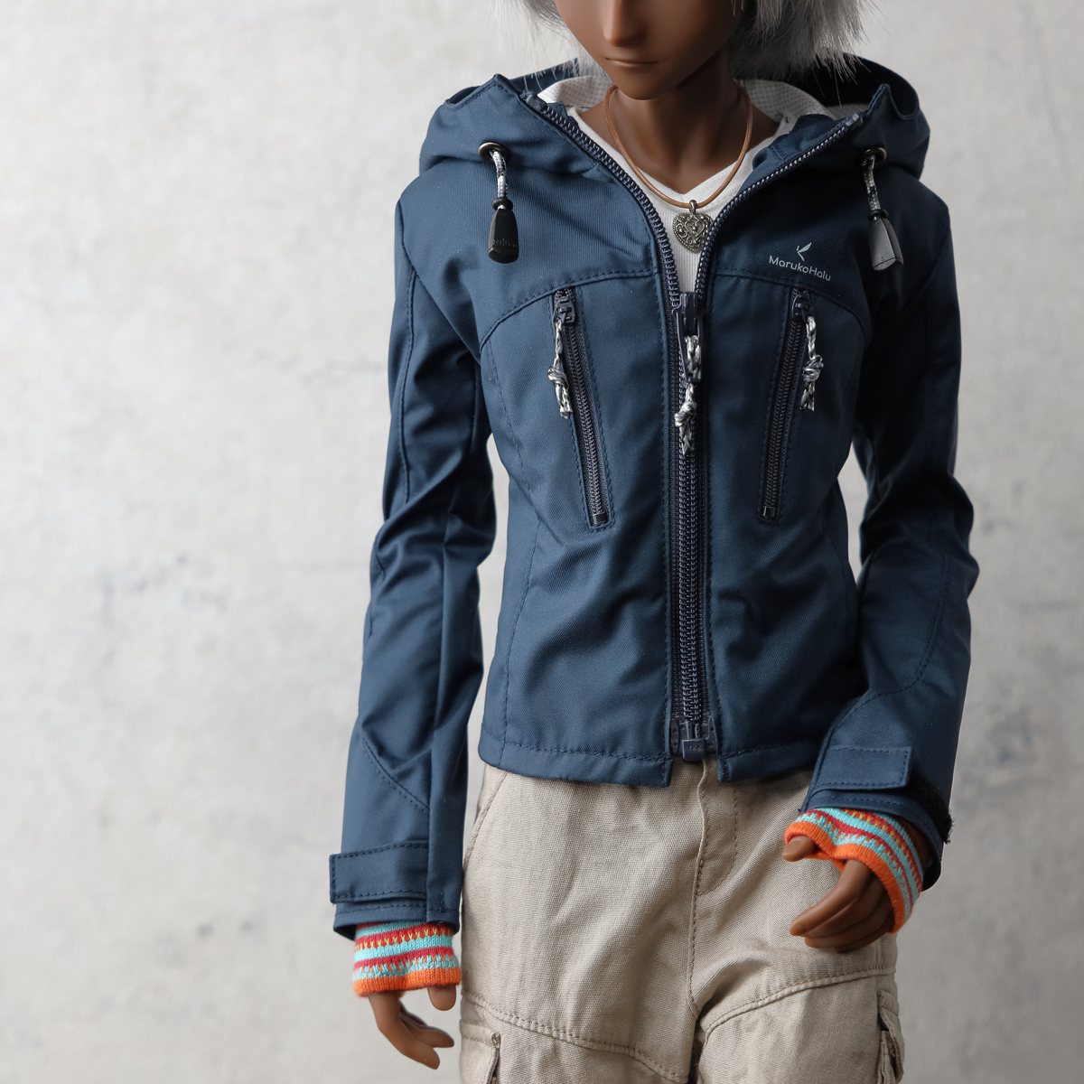 現代的なアウトドアジャケットをイメージした縦ポケットデザイン。視覚的なアクセントを優先しているためポケットファスナーは開閉できますがドールサイズの仕様都合で、限りなくダミーポケットです。 -