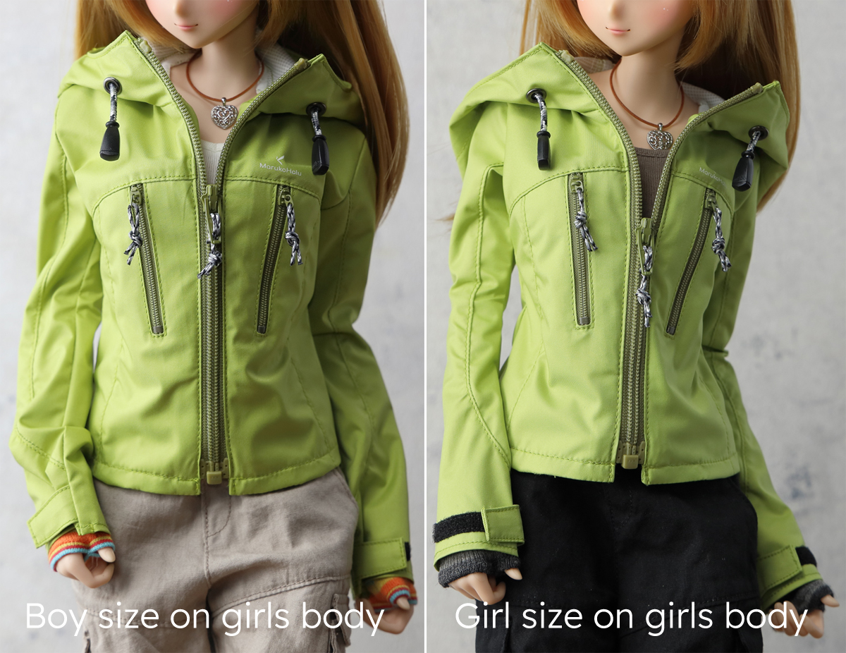 The silhouette is designed for a close, tailored fit when the front zipper is fully closed. The Boy – Unisex is based on the Smart Doll Boy body, with broader shoulders and a clean I-line silhouette. This Boy – Unisex provides a relaxed, oversized fit when worn on a Girls body.