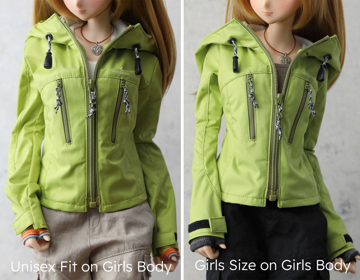 前開きファスナーを閉め切った状態でタイトフィットするシルエットで仕上げました。Boy – UnisexはスマートドールのBoyボディーをベースに肩幅を広め、ボディ部分は男性らしいIラインで作りました。このBoy – UnisexをGirlsボディに着用させた場合、全体的にゆとりのあるオーバーサイズフィットとなります。
