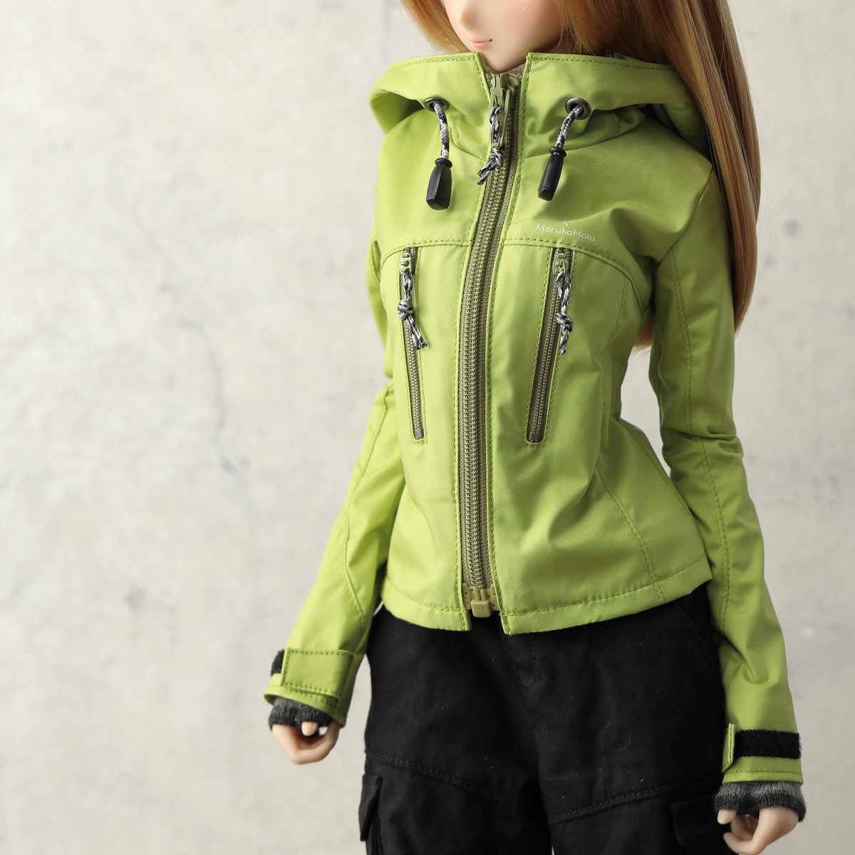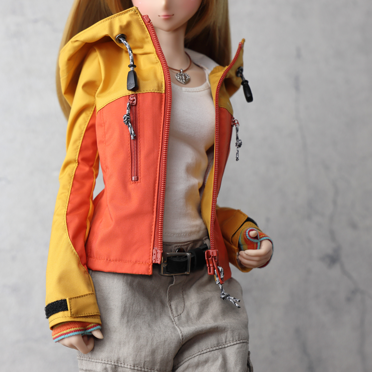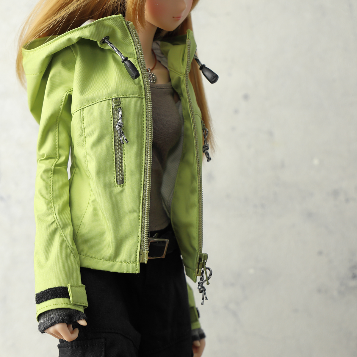 現代的なアウトドアジャケットをイメージした縦ポケットデザイン。視覚的なアクセントを優先しているためポケットファスナーは開閉できますがドールサイズの仕様都合で、限りなくダミーポケットです。