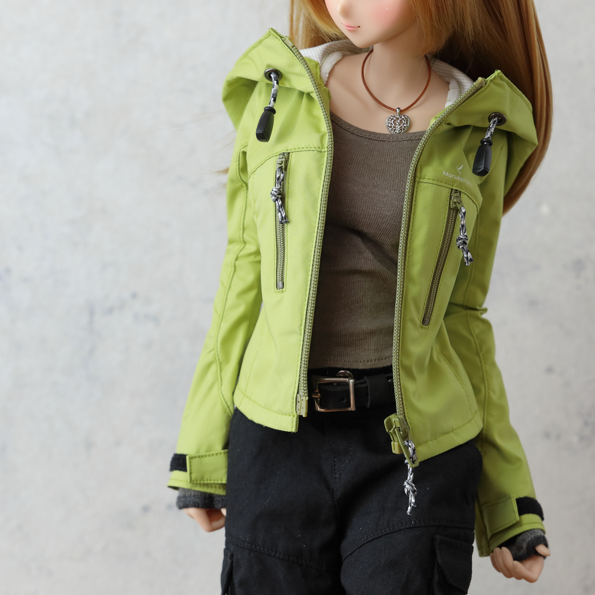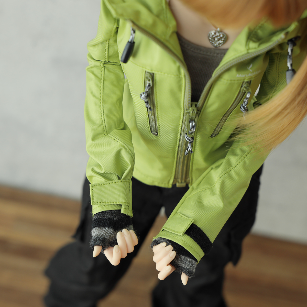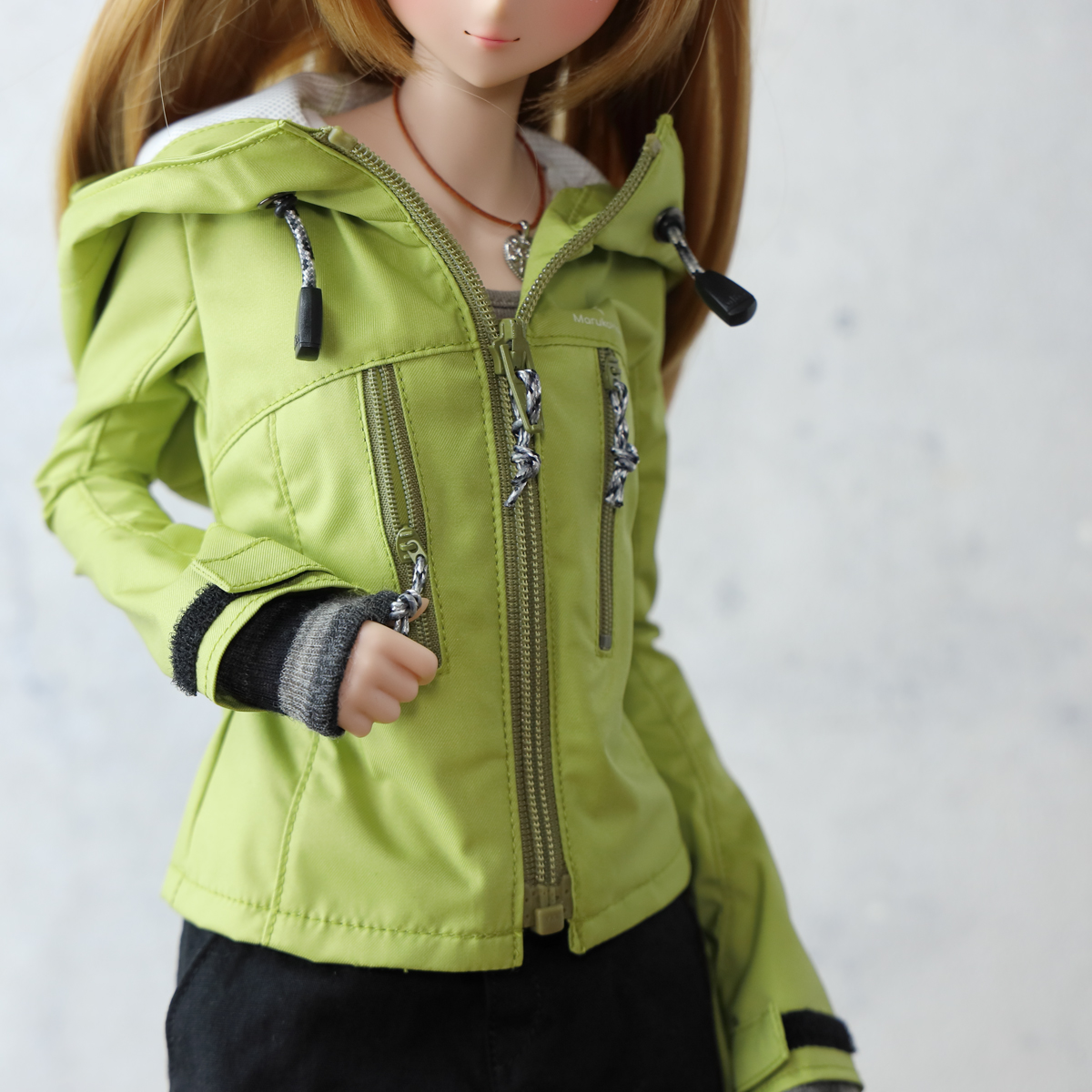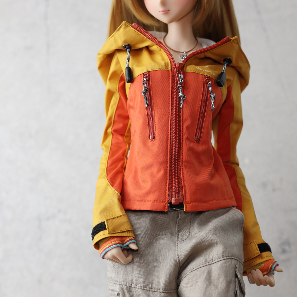 現代的なアウトドアジャケットをイメージした縦ポケットデザイン。視覚的なアクセントを優先しているためポケットファスナーは開閉できますがドールサイズの仕様都合で、限りなくダミーポケットです。