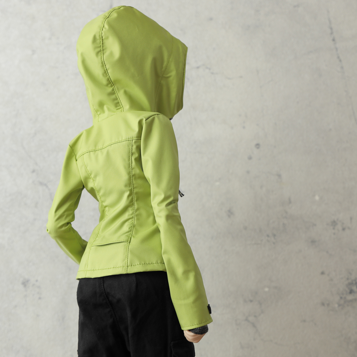 アウトドアジャケットに欠かせないフードには、アジャストできるドローコードをギミック的に設定しました。フードはショートヘアウィッグなら被れるサイズ感です。